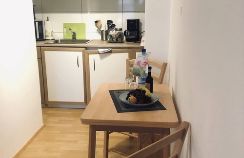 The apartment has its own kitchenette with cooking facilities, microwave, coffee maker, kettle, refrigerator and full kitchen equipment. A dining table with two chairs is available. A comfortable lounge chair offers a pleasant atmosphere while watching TV.