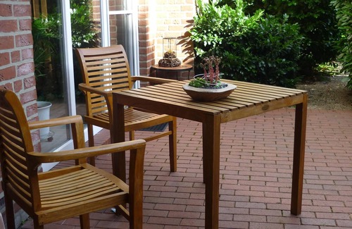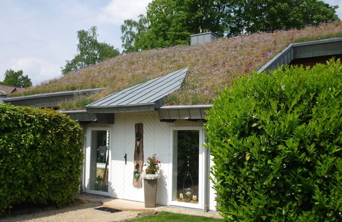 In the center of Neuenkirchen is the charming 2 room ground floor apartment (54sqm) with a separate entrance on the idyllic plot of a family house with a green roof.