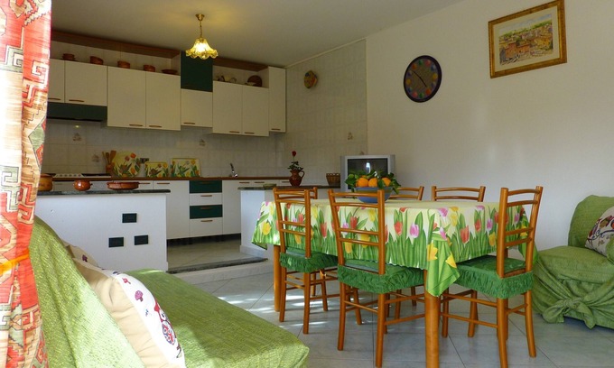 Large living room-kitchen equipped with various amenities. Living room: double sofa bed, armchair, cable TV, wi-fi, air conditioning. Kitchen: dishes and provisions, fridge with freezer, hob, oven. Double bedroom: double bed, 4 seasons wardrobe, chest of drawers, bedside tables, dressing table, bed linen. Bedroom: 2 single beds, wardrobe 4 doors, bedside tables, dressing table.,bedding. Bathroom with bath-shower, towels. Disengagement: sofa-bed, nightstand. Washing machine, clothesline located outside. The apartment is arranged to comfortably accommodate 5 people. The property is completely fenced, accessed by a gate with an electric lock.