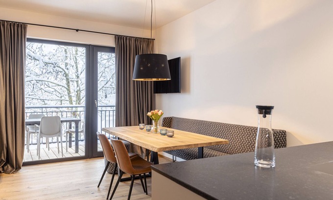 The stylish kitchen line in the vacation apartment is fully equipped, with cutlery and (cooking) dishes, ceramic glass cooktop, oven, refrigerator with freezer compartment and dishwasher. Also included in the equipment are a toaster, water kettle and a coffee machine. For your arrival, a small ALPS RESORTS starter set is available, consisting of dishwasher tabs, dishwashing liquid (sample), small sponge, garbage bags, cleaning and dish towel.