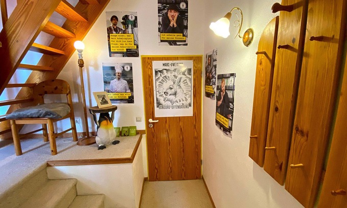 Our Känguru Apartment accommodates up to 6 guests with one bedroom, a living room, and a bathroom. In the gallery (2nd floor), there is a large bed and a single bed with a pull-out bed for a child underneath. The living area, accessible via a wooden staircase, offers a sofa bed for one or two people; when pulled out for two, it takes up much space. The small kitchen is equipped with two hotplates, a refrigerator, kettle, and coffee machine. The dining table seats four and offers a beautiful view over the fields. Private amenities include Wi-Fi for video conferences and a desk. There is no TV, but DVDs can be played. Pets are allowed for an extra fee. The apartment is thematically decorated and features a hammock, a punching bag, and many other details.
