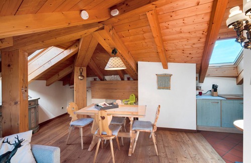 Located in Daiano, Val di Fiemme, this 90 sqm apartment accommodates up to 5 guests with 2 bedrooms and 2 bathrooms. The first bedroom features a double bed with space for a baby bed, while the second bedroom offers 2 single beds plus a pull-out third bed. You will find a fully equipped private kitchen on the upper level alongside a living area with mountain views. Amenities include Wi-Fi suitable for video calls, TV with video on demand, a dedicated workspace, washing machine, highchair, and baby bed.