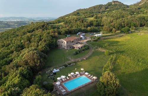 This 17th century farmhouse sits in the heart of a small valley surrounded by steep mountains, isolated from traffic noise. You have views overlooking the Cecina Valley and Volterra. Take relaxing walks along tracks and pathways leading into the woods, or explore the large park with centuries old Holm oak trees and a small stream flowing through reeds.