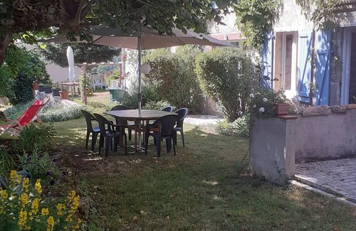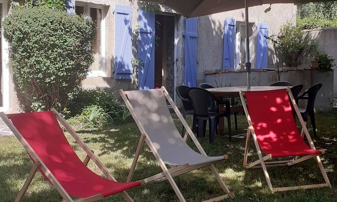 The holiday apartment Gite Le Tilleul in Lespéron is the ideal accommodation for a relaxing holiday with mountain views. The 90 m² property includes a living room with three sofa beds (two single and one double), a well-equipped kitchen with a table for four, a dining area with a table for six to eight people, a bedroom with two double beds, and a bathroom with WC. It can accommodate up to eight guests. Additional amenities include a TV, as well as books and toys for children. You will find the apartment cool as it is located in a renovated farmhouse. The property features a private outdoor area with a large shaded garden, a covered terrace with table, sun loungers and barbecue. A second stone table seats four, in the sun or shade. Dogs are allowed, but a floor mat is not provided.