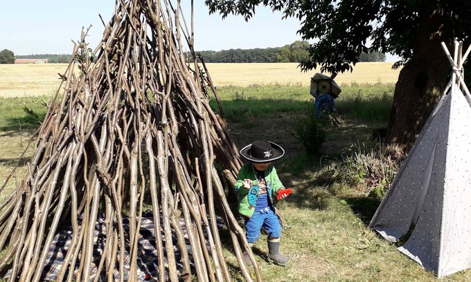 Upstairs there is: - 1 bedroom with double bed - 1 bedroom with 2 single beds - 1 modern bathroom with shower and toiletTwo apartments each include a patio with garden furniture, parasol & charcoal grill. The outdoor oven, a ping pong table and a tree house for children are available to our guests.After many years of classic agriculture, we now only farm our farm for our own use. The big and little alike discover here the life in the country: chickens, geese, pigs & co form the livelihood, horse "Rita" & pony "Felix" can be ridden and dwarf rabbits & cats invite to play.