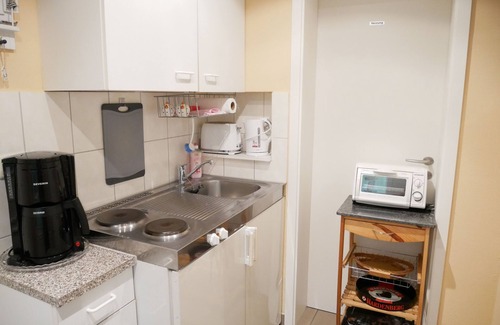 The cozy, modern furnished apartment is located on the ground floor. It has a bedroom with 2 separate box spring beds and a wardrobe. In the living room there is a couch (extendable 140 x 200) with table, TV, radio with CD player, a spacious wardrobe and a dining table with 2 chairs. In hall area, a kitchenette with 2 rings, fridge is with Gefriefach. A large daylight bath with shower / toilet and hairdryer. A sitting area in the garden, next to the apartment invites you to linger. Parking is free on the premises. Utilities included. Bed linen can be brought, or a linen package for 10 EUR p. Person once can be booked.