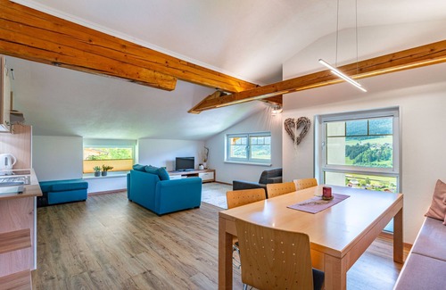 "Mawa", 3-room apartment 106 m2, on the top floor. Partly with sloping ceilings, cosy furnishings: living/sleeping room with 1 double sofabed, dining table, satellite TV and international TV channels (flat screen). 2 rooms, each room with 1 sofabed, 1 double bed, satellite TV and international TV channels (flat screen). Open kitchen (oven, dishwasher, 4 ceramic glass hob hotplates, toaster, kettle, electric coffee machine). Shower, sep. WC, double hand-basin. Heating. Parquet floors. Beautiful panoramic view of the mountains and the valley. Facilities: Internet (WiFi, free). Please note: non-smokers only. Note: Access via external spiral staircase or internally.
