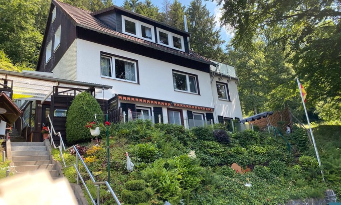 The property is situated directly on the edge of the forest, offering stunning views of the valley and mountains. Guests have direct access to hiking and mountain bike trail networks. Enjoy attractions such as Bocksberg, the summer toboggan run, the mountain bike park, Liebesbankweg trail, Harzer Schnitzelkönig, and a heated outdoor forest pool, among others.