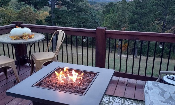 Mountain view. Personal deck! Wonderful shopping and restaurants, bars with live music. ALWAYS something to do. We are BIKER FRIENDLY with garage parking(let us know in advance) . Hiking, Kayaking, Walking, Fishing, Zip Lines, Caves to explore, Ghost tours, a buzzing restaurant district, or a night sky perfect for stargazing, to name a few outdoor activities. Girls trip, couples retreat, jeep, car or bike events this is your spot. Plenty on-site parking for trailers. If you have to go to the DAWG House why not ours in Eureka Springs? Refrigerator, Microwave, A/C & Heat, Ceiling fan., TV. Outdoor private covered back deck for your enjoyment with firepit. MAGNIFICENT views and sunsets.