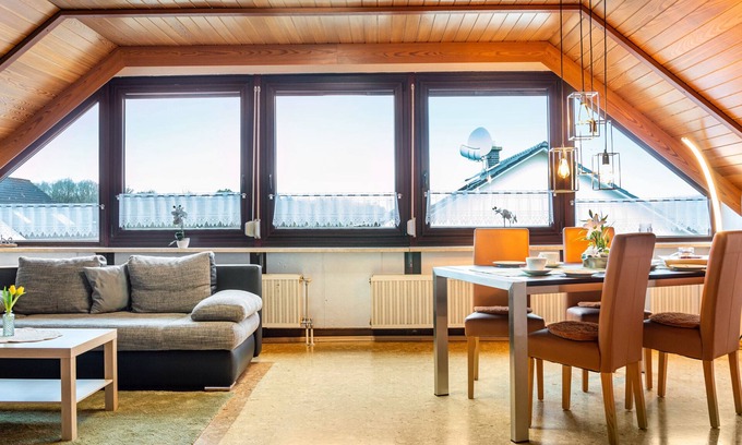 Overlooking the mountain, the holiday apartment Fewo Naturblick in Wiesenthau impresses guests with its fantastic views. The 65 m² property consists of a living room with a sofa bed for 2 people, a well-equipped kitchen, 1 bedroom and 1 bathroom and can therefore accommodate 4 people. Additional amenities include high-speed Wi-Fi (suitable for video calls) with a dedicated workspace for home office, a TV as well as a washing machine. A high chair is also available.