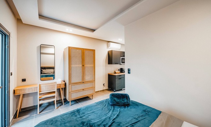 The holiday apartment Nima 1 with step-free access and interior is located in Corfu and is the ideal accommodation for a relaxing getaway. The 29 m² property consists of a living room with a sofa bed for 2 people, a well-equipped kitchen, 1 bedroom and 1 bathroom and can therefore accommodate 4 people. Additional amenities include high-speed Wi-Fi (suitable for video calls) with a dedicated workspace for home office, a smart TV with streaming services, air conditioning as well as beach/pool towels. A baby cot is also available. This vacation rental features a private balcony for your evening relaxation.