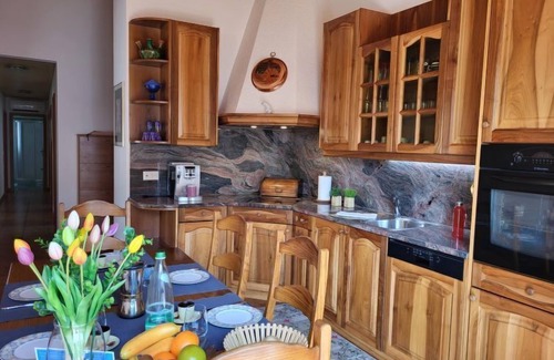 "Nora", 4-room apartment 130 m2 on 1st floor. Comfortable and cosy furnishings: living room with sloping ceilings with flat screen. Exit to the balcony. 1 double bedroom with 2 beds (90 cm, length 200 cm). 1 room with 1 double bed (1 x 160 cm, length 200 cm). 1 room with 1 bed (90 cm, length 200 cm). Kitchen-/living room (oven, dishwasher, 4 ceramic glass hob hotplates, toaster, kettle, electric coffee machine). Bath/WC, shower/WC. Oil heating. Parquet floors, natural stone floors. Balcony. Balcony furniture, electric barbecue. Beautiful view of the mountains and the countryside. Facilities: washing machine, iron, hair dryer. Internet (WiFi). Reserved parking (2 cars). Please note: suitable for families. Non-smokers only. NL-00007588