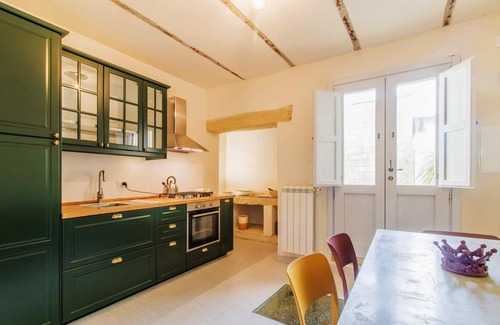 The 120 m² apartment 'Oikia Giuggianello Le Bey Fausta' in a unique historical residential complex is located in the center of Giuggianello in Puglia, at the southeastern tip of Italy. Puglia is known for its hill towns with whitewashed houses and hundreds of miles of Mediterranean coastline. The capital, Bari, is a lively port and university city. The modernly furnished apartment consists of a living area, a well-equipped kitchen with a cozy dining area, 2 bedrooms as well as a bathroom with a shower and can accommodate 6 people. Additional amenities include Wi-Fi, air conditioning, a washing machine, a dryer and cable TV. In addition, the apartment offers a communal outdoor area with greenery and courtyard with a shower. Here you can start an eventful vacation day relaxed with a delicious breakfast. Due to the central location, restaurants, bars and cafes are only 1-5 minutes on foot away (50-350 m), and the nearest supermarket is just around the corner (5 minutes on foot). The beach at Spiaggia di Baia dell'Orte is about 24 minutes away by car (18 km). Giuggianello is about 34 kilometers southeast of Lecce (25 minutes by car), known for its Baroque architecture, also called the "Florence of the South", and only a one-hour drive from the airport in Brindisi (87 km).