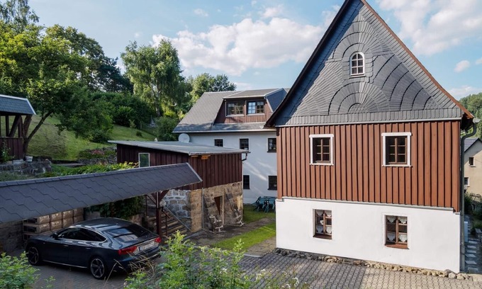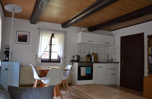 The separate, spacious apartment (65sqm) is located in a listed, lovingly restored, former servants house Bj 1900 in the National Park Saxon Switzerland. This includes a PkW parking space in the courtyard and free Wi-Fi. The apartment is suitable for a maximum of 4 people, but it is ideal for use by 2 people, as the bedroom is a connecting room to the bathroom and in the living room only a sofa bed is available.