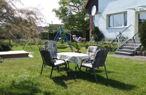 The apartment offers you a living room/bedroom with double bed and sofa bed, wardrobe, satellite TV (approx. 29 sqm), a children's room with 2 single beds, wardrobe (approx. 11 sqm), a fully equipped kitchen m. With oven, dishwasher, refrigerator, freezer, kettle, toaster, ... (approx. 12 sqm), a light lounge with 2 further sleeping facilities and TV, small book corner and seating area (approx. 15 sqm). Free WiFi everywhere. Our garden is very large and offers plenty of space to play for children. A barbecue m. Sufficient garden furniture and 4 bicycles with 2 child seats are available, your own skills are placed. 2 free parking spaces are on the property.