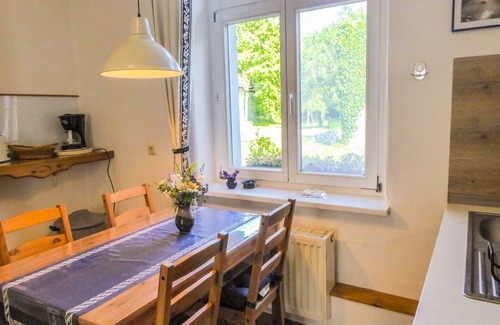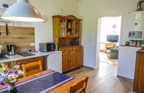 In a building of the early 19. Century., The former village school, is today a quiet separate Apartment. It is completely renovated in 2013 and for the first time as a guest apartment - been equipped - ideal for two people. Bright spacious rooms, modern and comfortably furnished, are open all year. For maximum comfort of all guests, this apartment is consistently rented as a Non smoking apartment. For the same reason, we can not allow pets. In the living room a large couch invites you to feel good, the spacious bedroom has a double bed (180x200, separate mattresses) and can be darkened well. The kitchen overlooking the garden is equipped with modern facilities. It has a kitchenette with sink / hob, fridge freezer, coffee maker, kettle, toaster and microwave. In the bathroom is a tub with shower function. The apartment has a quiet spot in the garden with garden furniture and two sun loungers. If desired, a self brought along children travel bed can be placed in the bedroom. Internet WLAN is available free of charge.
