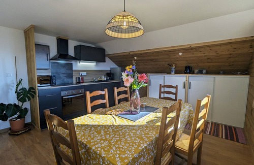 - a living room with: A fitted kitchen, 3 induction burners, oven, fridge freezer compartment, dishwasher, microwave, filter coffee maker, toaster, kettle, kitchenware, raclette, fondue. A dining area that can accommodate up to 6 people. A lounge area with sofa, TV, WiFi.