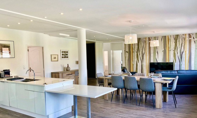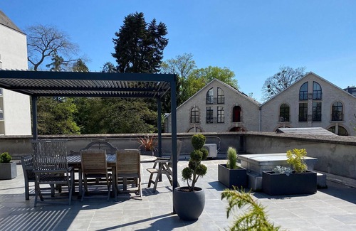 A charming apartment 1 hour from Paris by train (1h30 by car) and just 1 km from the city center of Orléans and its shops, restaurants, cinemas, gardens... An 8-minute walk from the banks of the Loire and 3 min walk from the tram. You can take advantage of your stay to discover our city and its Center Val de Loire region and its castles, the castle of Meung-sur-Loire and the castle of La Ferté-Saint-Aubin 20 km away, the castle of Chambord 50 km away. .. but also the Parc Floral 8 km away... This apartment is located on the 1st floor (no lift) with two private parking spaces in a closed courtyard. This apartment is the only one in the building, quiet. It has an area of 180m² which consists of an entrance with cupboards, a large very bright living room/living room opening onto a fully fitted and equipped kitchen, a laundry room with washing machine, dryer and separate toilet, a bedroom with a 180x200 bed with its adjoining bathroom offering a shower as well as a bath and a toilet. A 2nd bedroom with 1 bed 160x200, the 3rd bedroom with 2 beds 90 (+ 2 beds 90 extra drawer) and the fourth bedroom with 1 bed 140. A separate bathroom with wc. A cot and high chair are available. On the 2nd floor, you can enjoy a 180m² terrace with garden furniture and gazebo. The roof terrace is vegetated. For your comfort, bed linen, bathroom linen, kitchen linen and the cleaning fee are included in the rental price. The beds will be made upon your arrival. Air conditioning in the living room and the 4 bedrooms. Parties are not allowed. Arrival from 4 [hidden] and departure 10 [hidden] Unless stated, services such as cleaning, bed linen, towels etc. are not included in the price of this rental. If pets are allowed (information in the advertisement), charges may be applicable. Only equipment mentioned in this advertisement are present. Equipment not mentioned are not considered to be present.