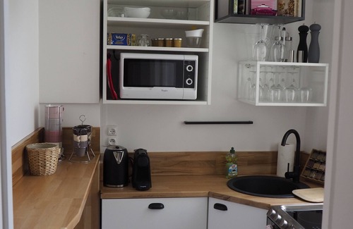 Kitchen fully equipped with a fridge, microwave oven, dishwasher, washing machine, nespresso.