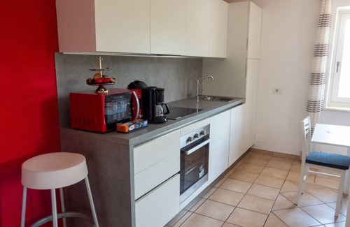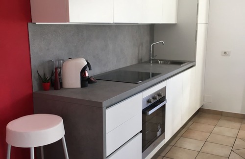 The kitchen has an electric oven, dishwasher, induction hob, coffee machine and everything necessary for daily use (new pots, cutlery and crockery) and a table that can seat 8 people.