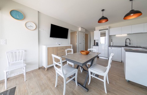 The residence is located in the center of La Tranche-sur-Mer, facing the beach. The apartment is located on the second floor (with elevator) and comprises a living room, a fully equipped kitchen, 2 bedrooms and a shower room, and can therefore accommodate 4 people. Additional amenities include Wi-Fi, three televisions, air conditioning and a washing machine. This vacation rental has a private terrace for relaxing evenings.