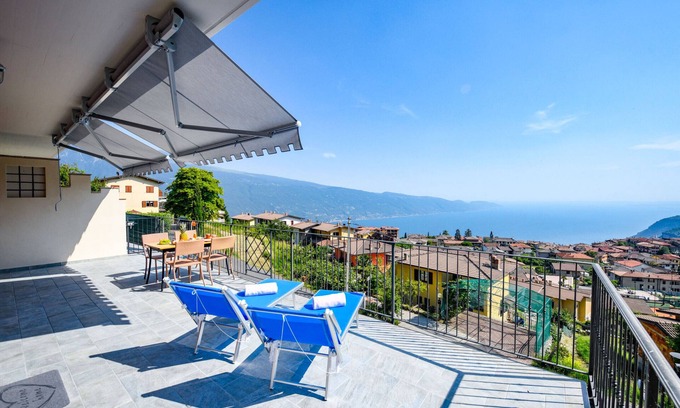 From the terrace, even from the sofa in the living room, it is possible to admire the sunrises and sunsets over Lake Garda. The view extends to the other side of the river from Peschiera and the Gulf of Salò. In the evening you can enjoy a breathtaking view of the illuminated villages along the lakeside road, an unforgettable sight. Perfect for a romantic dinner on the terrace.