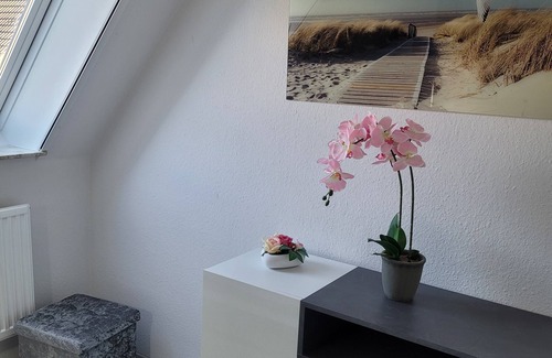 Bright, modern apartment on the top floor of a family home on a well-kept plot with a view of nature. The Aventofter Forest is about 500 meters away. The house is located near the Danish border in Aventoft. There are many shops there that are also open on Sundays. Bicycle rental is also based there. The glider airfield is in the immediate vicinity, so that you can occasionally watch the amateur pilots. Deer and the "Sort Sol" natural phenomenon can also be observed from the apartment. The Nolde Foundation with museum and beautiful garden is only 5 kilometers away. The islands and Halligen also invite you to visit. It is almost 30 kilometers by car to the ferry pier to Dagebüll. Sylt can also be easily reached by train from the train station in Klanxbüll (approx. 14 kilometers away). On the Danish island of Rømø (approx. 50 kilometers away) there are miles of wide beaches where you can also relax. Danish soft ice cream is a specialty there. In the garden of the house you can admire a small rabbit breed.