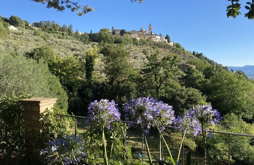 A third apartment is occupied by the owner. The Villa is situated in a superb position with magnificent views across the Vale of Umbria to the Martani Mountains and to the nearby town of Trevi, which can be reached by foot in only ten minutes. Trevi has an unspoilt charm and offers several very good restaurants, a pizzeria, bars and shops. The beautifully restored Villa lies in a semi-fortified estate just outside the city walls. Below the house is the secluded garden which has a large salt water swimming pool (12m x 6m). Il Tramonto has a large double bedroom which leads directly onto a private terrace with wonderful views across the surrounding countryside and towards Trevi. There is a second bedroom with two single beds which can be combined. The apartment has a bathroom with shower and small bath tub and a new kitchen/dining room with induction hob and oven. The apartment is spacious, light and comfortably furnished. There are mosquito nets on all windows.