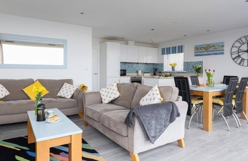 Wow!! is usually the first word. Set in a stunning position in an idyllic location. Situated overlooking Whipsiderry Beach, sadly the steps to Whipsiderry are temporarily closed, but it is only a short walk to Porth Beach or Watergate Bay, this 2 bedroom cool coastal contemporary apartment is superb, and is the ideal surf retreat, light and airy, set in a perfect spot, in a area of outstanding natural beauty, overlooking the sea, and a central spot for exploring the wonderful, rugged coast and beautiful Poldark Country. The apartment has been recently decorated with new flooring and furnished to a tasteful extremely high standard, with modern comfortable sofas, large 55 inch curved screen TV, music system and many extras. You will need to use an electronic key fob to gain entry into the block along with the added benefit of allocated secure parking for one car in the basement The apartment has a large open plan lounge/kitchen/diner fantastic bi-fold doors that fully open onto a delightful balcony overlooking the sea, giving you a feel of complete open space, where on warm barmy nights you can sip your wine. the apartment is equipped to the highest standard, with everything you could possibly need. The kitchen is fully equipped with white gloss units, oven, ceramic hob, Integral washing/dryer machine, integral fridge/freezer, dishwasher, microwave, etc. and beautiful granite worktops and games for the children. Free Wi-Fi for the guests. The luxury bathroom and en-suite are both fully tiled and have power showers, plenty of storage space and soft fluffy white towels provided. Please bring your own towels for the beach. Should the need arise the apartment has underfloor heating with thermostats in each room. The bedrooms have fully fitted mirrored wardrobes, and there is a utility room for the storage of you cases. There is also a surf cage in the car park for use to store wetsuits, surf boards, etc. The apartment is situated on the ground floor, in a non smoking complex, with the choice of stairs or a lift if coming up from the underground car park or a ramp if entering from the road. Although in a quiet location it is easy to reach many of Cornwall's main towns and attractions. It is an excellent base for exploring Cornwall. Although you don't have to go far as so many fantastic beaches right on the doorstep, the apartment is situated opposite Whipsiderry Beach, and just 4 mins walk to Porth Beach. There are numerous places of Interest locally including many National Trust properties, St Michaels Mount, Landhydrock House, Trerice House, Bedruthan Steps, Crantock Beach. On the other hand you are only minutes away from Newquay with it's wonderful Surfing beaches - Fistral where the international and national competitions are held, golf club, pubs, spas, wine bars, restaurants and Newquay Zoo. If you are feeling energetic, you can always hire a bike [electric bikes now available at Porth Beach] and cycle the Camel trail. Across the road from the apartment are magnificent cliff top walks, and turning to the left you can walk across to Porth Island a bronze age burial site or turning right you can walk to Watergate Bay approx. 1 mile. I can highly recommend a stroll along the cliff in the morning, or evening and watch the amazing sunsets. You get a feeling of complete safety and relaxation whilst staying at the apartment. Newquay Airport is 2.8 miles away should you wish to fly down also Newquay Station is approx. 1.5 miles away with links from London, Watergate Bay is approximately 1 mile away, where you can join the Surf school or dine overlooking the beach. Locally there are numerous restaurants, and a good choice of major supermarkets in Newquay. A fantastic spot for exploring Cornwall. The apartment is cleaned after each guest leaves.