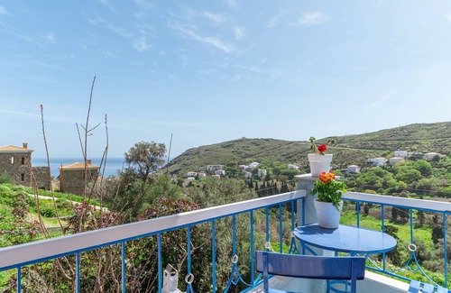The holiday apartment "Stenies' Nook Family Home" is located in Andros and boasts a beautiful view of the Aegean Sea. The 50 m² property consists of a living room, a well-equipped kitchen, 1 bedroom and 1 bathroom and can therefore accommodate 4 people. Additional amenities include Wi-Fi (suitable for video calls) with a dedicated workspace for home office, a TV, air conditioning, heating as well as children's books and toys. A baby cot and a high chair are also available.