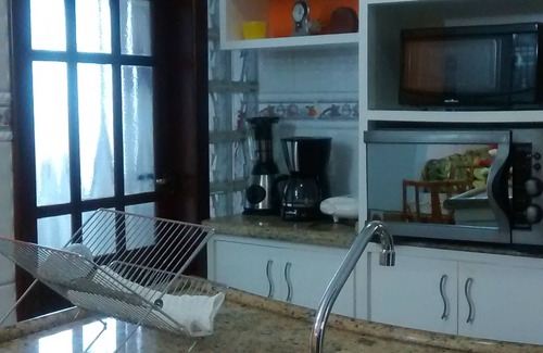 Kitchen with dishwasher, stove, refrigerator, water filter, microwave, oven baking, blender, sandwich maker, coffee maker, utensils in general, etc.