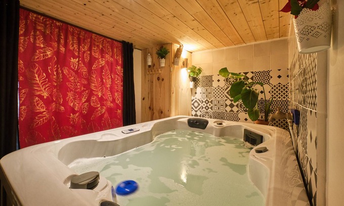 The property features a chic and naughty design with a French touch. The following amenities are available on site: a king-size (160 by 200 cm) bed, a private jacuzzi, an infrared sauna, an XXL shower, a mini-bar fridge, a capsule coffee machine, a tea kettle, assorted teas, and a big-screen HD TV.