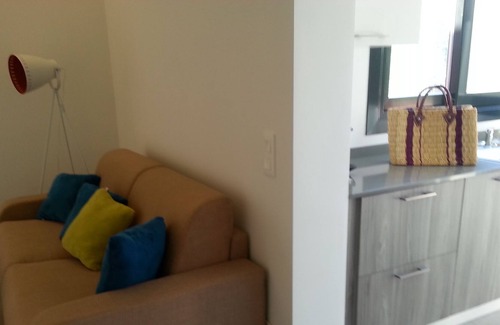 - A small living room with opening onto the fully equipped kitchen with oven, microwave, a large fridge-freezer, dishwasher, Nespresso coffee machine, induction hob 4 burners. The whole giving on a small terrace equipped with its garden furniture.