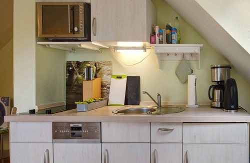 You reach a charmingly furnished 70m² apartment in the attic of a bungalow through its own side entrance. Three large beds with very good mattresses and a pirate bed are available. In a large kitchen-living room you can play or read, while in the living-bedroom apartment you can watch TV and in the small room you can use the laptop table or take a nap. A large shower room with window and toilet is appealing. The kitchenette is equipped with microwave, toaster and dishwasher, among other things. Garden furniture is available in the garden, sandbox and lawns are for shared use. A terrace with wooden seating furniture is available for personal use. Also a garden grill can be used.Walks, hikes, bike rides, beach visits, compare Baltic Sea bridges, admire spa building style, boat rides, taste fish rolls, visit the butterfly farm, the pirate playground or the bouncy castle playground, play (pirate) mini-golf, visit a circus performance, theater visits, cinema visits, trip to the zoo in Wolgast, quad tour, ...