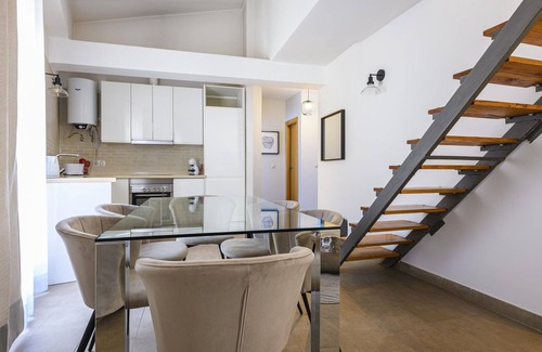 The apartment is located in a neighborhood that lives during the night, is fully equipped, furnished and recently decorated to a high standard. It has 1 double room on the main floor and the main room on the upper floor with access to the terrace. The living-dining room is on the main floor along with the kitchen. The bathroom with shower is adjacent to the lower floor bedroom accessed from the bedroom. The kitchen has all the necessary utensils for cooking, if you wish.