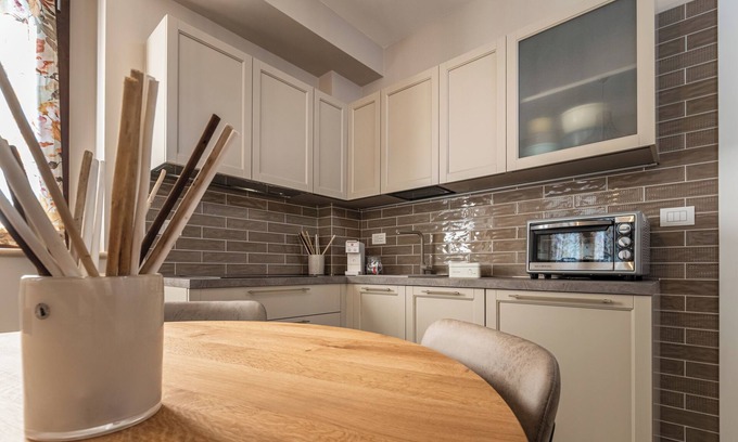 The entrance leads directly to the living area with a large kitchen equipped with everything you need (induction hob, fridge, coffee machine, kettle, pots and pans), dining table and modern style sofa bed. The bedroom with double bed is furnished in a sober and elegant way. The private bathroom is equipped with a shower and complete with a set of towels, shampoo and hairdryer. Furthermore, a laundry room complete with everything (washing machine, drying rack, ironing board, iron) is also available for all our guests.