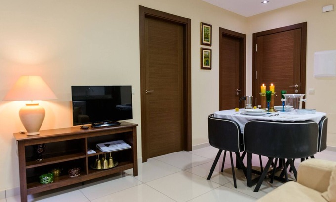 The apartment consists of a bedroom with a queen size bed and a double wardrobe, a living room with a sofa bed, dining table and TV, fully equipped kitchen and bathroom with a shower.