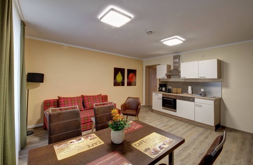 In the house "Apartments am Schwibbogen" you will find a fully equipped apartment. Up to 6 guests can sleep in it comfortably. In addition to the bedroom, equipped with two large box spring beds, is located in the apartment a second separate bedroom with bunk beds for 2 adults, bathroom with shower / WC and a guest toilet. Also in the living area there is the possibility for another 2 persons to spend a cozy night. A fully equipped American kitchen provides a communal holiday feeling. 2x TV flat screens, free Wi-Fi and a balcony are available. Secured parking space / parking space available on request. After a thorough renovation and restoration phase of the entire building, in 2017, we are pleased to welcome you to the newly opened "Apartments am Schwibbogen".