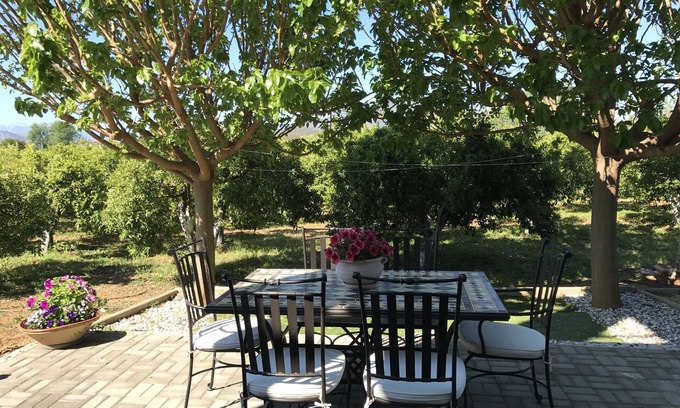 A modern apartment, ideal for all year round holidays. The apartment is suitable for family vacations or couples in a quiet environment near the beach (only 300m away), situated in a citrus field. The apartment has 2 bedrooms and a spacious living room. In the living room there is a TV for your entertainment and two large sofas. There is also a dining area for your noon or evening meals. The kitchen is fully equipped to make easy for you to prepare your meals. A basket of local products waits for you when you arrive.