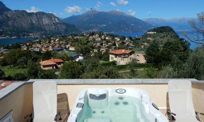 Equipped with private garden, three terraces with stunning panoramic views of the two branches of Lake Como, one with a private Jacuzzi; conditioned air; can accommodate up to 5 adults plus a child; includes double bedroom with cot on request, n. 2 queen size beds and a sofa bed in the living room;