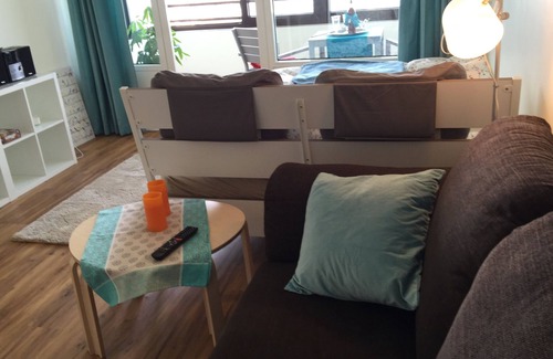The apartment is on the 7th Floor of a house, which is part of a modernized holiday complex. It measures 34 square meters and offers 2 people enough space to relax. You will find a closet in the entrance area, which u. a. Space for your clothes and other utensils. A modern shower room and a fully equipped kitchenette with an electric stove, GSP, microwave and refrigerator should make your stay a pleasant one. You can enjoy your breakfast at the dining area in the room or on the loggia. You can also relax on the cozy sofa or in the 1.60 m wide double bed. You could watch TV comfortably from both occasions.