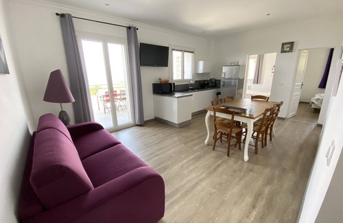 - living room with sea view, equipped with a TV, a sofa bed and an equipped kitchen (fridge, dishwasher, induction hob, microwave, coffee maker, kettle, toaster and dishes).