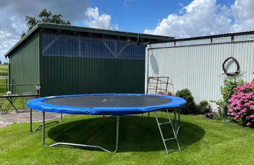 This maisonette holiday flat extends over a living space of 70 m² on the ground and upper floor. It is divided into a double room and a children's room, a shower room with WC, as well as an open-plan living and dining area with integrated kitchenette. While the two bedrooms and a separate WC are located on the upper floor, the communal rooms and the shower room with WC are on the ground floor. In the first bedroom, you sleep in a double bed measuring 200 cm x 180 cm, which is surrounded by bedside tables with reading lamps on both sides. A double-door wardrobe with drawers provides storage space for your travelling wardrobe. The second bedroom is ideal as a children's room. It is furnished with a bunk bed with two 90 cm x 200 cm mattresses and a 90 cm x 200 cm single bed, a wardrobe and offers plenty of space to play. In the living area, you can relax on an XXL couch with a sofa bed in the evening. The flat-screen TV with satellite TV and a stereo system provide entertainment. Next to the sofa, the dining table with four chairs invites you to enjoy a meal together. The kitchenette allows you to cater for yourself with a dishwasher, a four-ring hob with oven, a coffee machine, a toaster and a fridge. The bathroom has a shower cubicle, hairdryer, WC and wash hand basin. Outside: Garden available; Barbecue; Total car parking spaces: 1; Terrace; Living: 1st extra bed; Year of construction: 2000; Best of; Iron; DVD player; Bunk bed(s); Music system; Satellite TV; TV; Bath/WC: Shower; Hairdryer; Toilet; Cooking: Oven; Freezer; Stove; Coffee machine; Refrigerator; Microwave; Dishwasher; Toaster; Kettle; Other: Provider lives on the property; On the farm; Heating; No group bookings; No youth groups; Cot/baby bed; High chair; Non-smoking property; Vacuum cleaner; Tumble dryer nearby; Washing machine; WiFi partly available