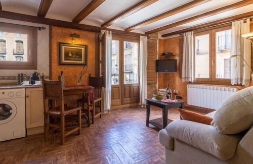 Princess and Laguna apartment. Light and clarity Ocher, yellow and raw tones in walls, curtains and armchairs. Forge and wood, ceilings with wooden beams and revolts. Stone and brick The best views of the entire building to the Plaza de Santiago, with its stepped fountain, its palm trees, pigeons drinking water and raising the flight creating a picture postcard ...