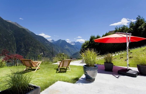 "Zenkei", 3-room apartment 86 m2, on the ground floor, south-east facing position. Spacious and bright, modern and tasteful furnishings: open large living/dining room with sliding door, panoramic window with TV and hi-fi system. Exit to the terrace. 1 double bedroom with 1 double bed (2 x 80 cm, length 200 cm). 1 room with 2 beds (90 cm, length 200 cm). Large, open kitchen (oven, dishwasher, 4 ceramic glass hob hotplates, electric coffee machine, Capsules for coffee machine (Nespresso) extra, raclette grill, fondue Set (cheese)). Bath/WC. Floor heating. Large terrace 75 m2, south facing position and, east facing position. Terrace furniture, barbecue (portable), deck chairs (2). Marvellous panoramic view of the mountains, the valley and the countryside. Facilities: washing machine, dryer, sauna (extra), iron, children's high chair, baby cot for up to 3 year olds (extra), hair dryer. Internet (WiFi, free). E-charging station. Please note: suitable for families. Non-smokers only. Private entrance, fire extinguisher. Sauna use: Reservation is always required. It has an additional cost of CHF 10.00 per session. -. NL-00002170