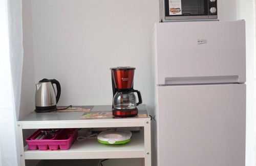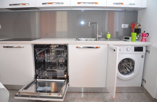 The kitchen is equipped with a stovetop, a refrigerator, and a dishwasher, as well as a coffee maker, an electric kettle, and a microwave. Bathroom amenities include a hair dryer, a bidet, and towels. And you won't have to pack extra clothes, because you'll also have access to laundry facilities. Other amenities at this 1-bedroom, 1-bathroom rental include bed sheets, air conditioning, heating, and a dining table.