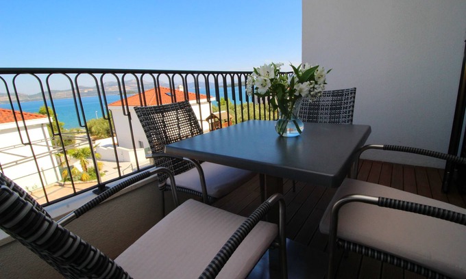 This comfort one bedroom apartment features free WiFi, air-conditioning, well-equipped kitchen with dining area, an SAT/flat-screen TV living room with sofa and a private bathroom. Private bathroom comes with shower and a hair dryer. It will also provide you with a lovely furnished balcony with a sea view. This one bedroom apartment can comfortably accommodate up to 5 persons.