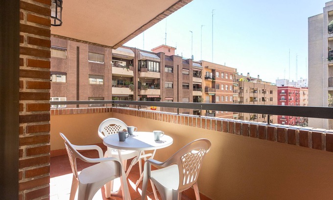 Homely and familiar apartment a few meters away from the Mestalla Stadium. Its greatest virtue is its luminosity. Spacious, modern, practical and quiet. It has all the current comforts. Located in a good area, with a wide range of restaurants and leisure and good connections to reach the downtown area and the area of the beaches. It can accommodate up to 6 people.3 double rooms, 2 bathrooms, air conditioning and central heating, WiFi, kitchenette.The space:The apartment of 102 m2 has the following areas:- Simple main bedroom with double bed of 150x190 cm, spacious wardrobe with drawers and en suite bathroom.- Practical and complete en suite bathroom with shower, sinks with drawer, mirror and toilet.- Spacious second bedroom with single bed of 90x190 cm, comfortable desk, ample wardrobe, drawers and access to balcony.- Spacious third bedroom with single bed of 90x190 cm, comfortable desk and ample wardrobes.- Modern and complete bathroom with shower and screen, toilet, sink with mirror and bidet.- Spacious and bright living room with two sofas, HD TV, long dining table for six people and access to terrace.- Large terrace overlooking quiet street with table for 4 people.- Ample and bright fully-equipped kitchenette with dining table for two people and with all kind of appliances: dishwasher, washing machine, microwave, oven, fridge/freezer, Nespresso coffee machine, kettle, toaster and blender.The apartment comes with bed linen, towels and welcome amenities.Guest access:- Living room and kitchen.- Free WIFI.- Central air conditioning and heating.- Parking.Interaction with guests:We would love to attend and advise you about everything you can do in the city of Valencia: gastronomy, sports, museums, culture, entertainment, shopping, golf, children, business…The neighbourhood:This apartment is located in the neighbourhood of Mestalla, a few meters away from the Stadium of Valencia Club de Fútbol and the Avenue of Blasco Ibáñez (the university area of Valencia and, therefore, one of the areas with more young people in the city).In this district you will find a wide range of restaurants, pubs and leisure activities. You can visit emblematic buildings, such as the Exhibition Palace and the Military Historical Museum, and you can go to the cinema, restaurants, terraces, breweries and supermarkets. About 5 minutes from the apartment there are two subway stops with which you can move to the downtown or the beach areas and, on the opposite side of Blasco Ibáñez Avenue, about 15 minutes on foot, you will find the district of Benimaclet, a lovely area with many places to eat and to discover.At the western end of the neighbourhood are the Turia Gardens and the Palau de la Música, where concerts, orchestras and other cultural events are held. The gardens are an urban park, with a length of about 7 km, that run through what once was the bed of the Turia river. Throughout this park you will find the City of Arts and Sciences, The Gulliver Park, tracks in which you can practice different sports, and bike and a running path, all surrounded by abundant vegetation.Getting around:Bus stops, metro stations, a taxi rank and a bike path are available just a few meters away from the apartment:- Bus: stop Blasco Ibáñez - República Argentina (lines 30, 31, 71, 81 and N1), 6 minutes on foot. Blasco Ibáñez - Almela i Vives (lines 30, 31, 71 and 81), 6 minutes on foot.- Metro: Amistat-Casa de la Salud Station (lines 5 and 7), 9 minutes on foot. Aragón Station (lines 5 and 7), 6 minutes on foot.- Taxi: rank at Avenida del Puerto, 111, 1.5 km away.- Bike path: on Blasco Ibáñez Avenue, 2 minutes on foot.House rules:- Check in from 03:00 p. m. to 09:00 p. m- Check out from 09:00 a. m. to 11:00 a. m(Out of time to a surcharge of 30 Eur).- No parties.- No smoking.- No pets.- No more guests.- Responsibility, respect and good behaviour towards all facilities of use and neighbours.- Respect the rest times, from 10:00 p. m. to 10:00 a. m.