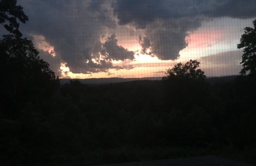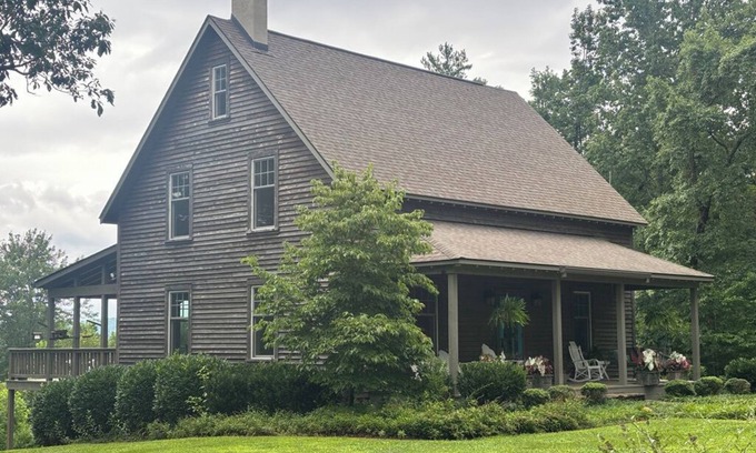 Rustic exterior by design, contemporary interior, situated in the middle of 25 wooded acres. Enjoy morning coffee in front porch sun after country quiet sleep, except maybe an occasional owl, bobcat, or coyote call. Or sit on back deck for morning sun and shadows play on Blue Ridge Mountains ridges and valleys, with Syon Abby brilliantly lit on sunny mornings. Or sit in rocking chairs at solar installation and watch honeybees at work, season permitting. Come evening sun sets behind the Blue Ridge, and on clear nights enjoy the stars.