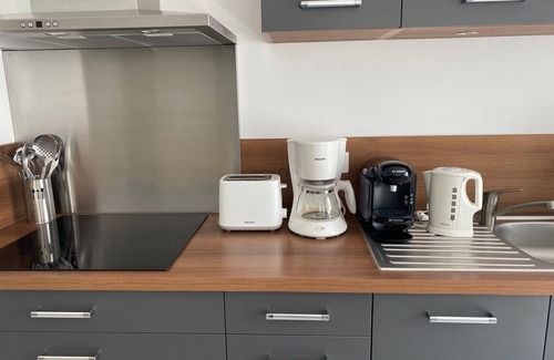 Open kitchen well equipped, 1 round table with 4 chairs. Refrigerator-freezer, microwave, ceramic hob, toaster, coffee maker, kettle, dishwasher, oven.